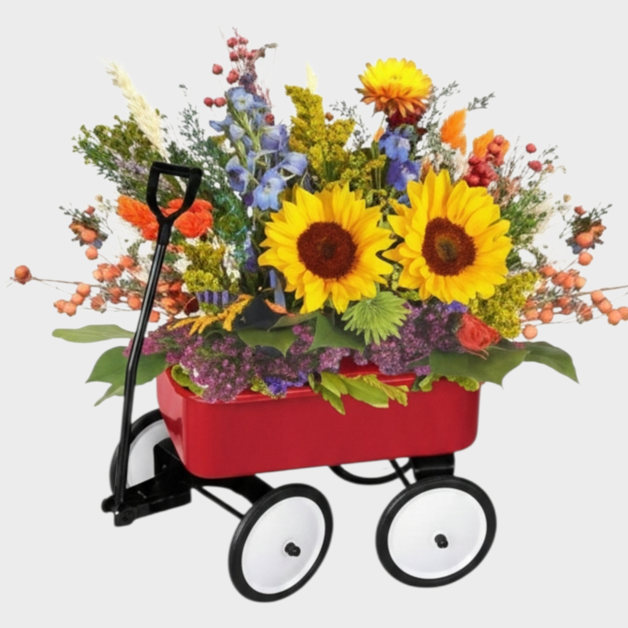 Delivered in Teleflora’s 5″ x 3″ red metal wagon with moveable wheels.