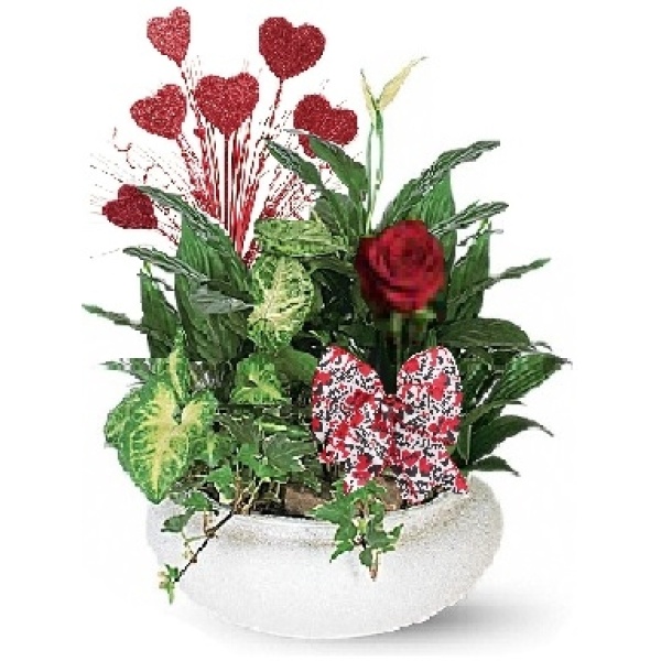 Four to five different live green plants will arrive in a lovely ceramic vessel (in soil) along with a single-stem rose in water tube, Valentine’s bow, AND a fun, removeable cluster of red sparkled hearts…all included in price!
