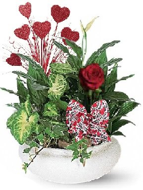 Four to five different live green plants will arrive in a lovely ceramic vessel (in soil) along with a single-stem rose in water tube, Valentine’s bow, AND a fun, removeable cluster of red sparkled hearts…all included in price!