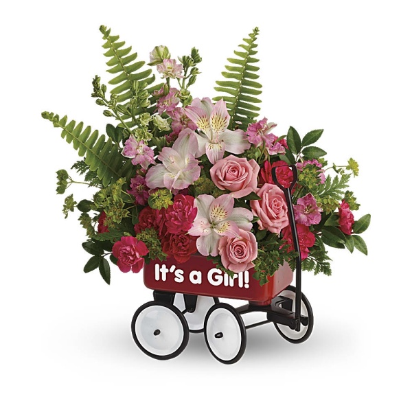 Delivered in Teleflora’s Baby’s First Wagon with moveable wheels.