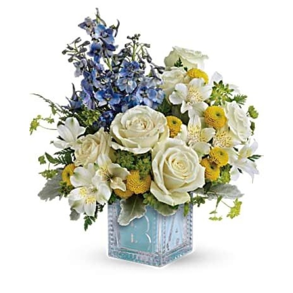 Welcome the new addition with a charming glass baby block keepsake, bursting with a sweet bouquet of roses, mums and delphinium.