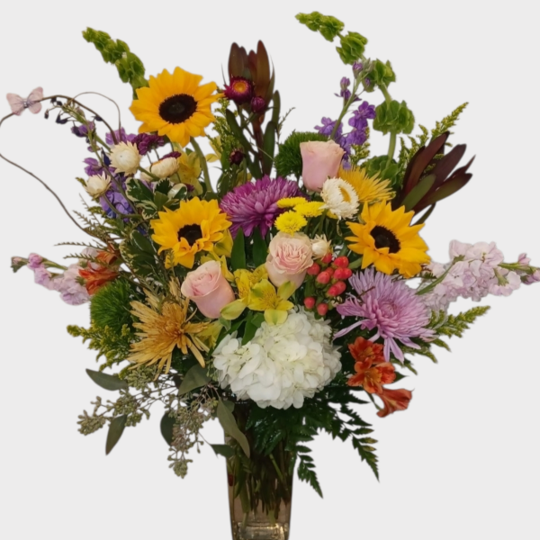 A truly bountiful display, this piece showcases its generous inclusion of golden sunflowers and a vibrant medley of colorful blooms.