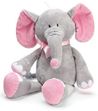 Plush gray elephant with pink satin ribbon bow…is for the tiny “elephant-lover” we all know!