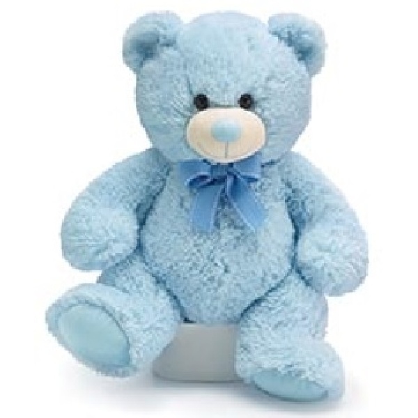 A plushy soft powder-blue teddy bear…is a PERFECT baby gift!