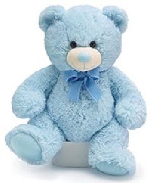A plushy soft powder-blue teddy bear…is a PERFECT baby gift!