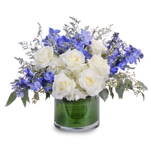 This elegant arrangement features a Serene blend of pristine white roses and hydrangea, beautifully contrasted with regal blue delphiniums creating a sophisticated