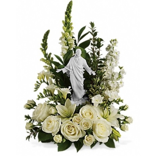 Famed sculptor Stuart Mark Feldman designed this graceful, meticulously detailed porcelain sculpture of Jesus for all religious gift-giving times. This free-standing statue will be cherished as a stunning work of art. Flowers will be mostly white – unless you specify otherwise.