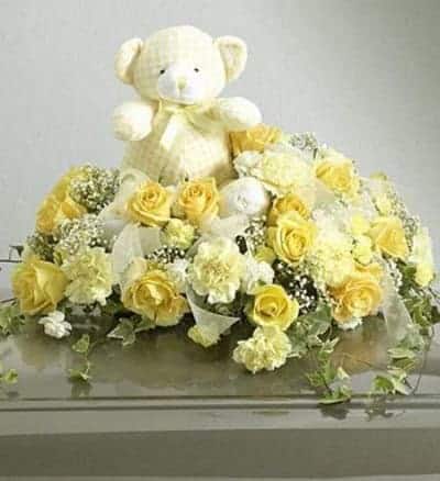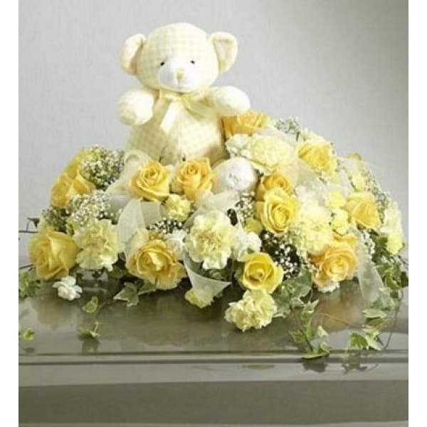 This touching spray is then completed with a plush bear on top. Available in pink or blue. Components may vary.