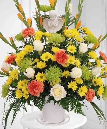 This traditional funeral basket becomes that much more personal with a lovely white ceramic angel on top for all to see…but for a family member to keep.