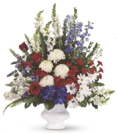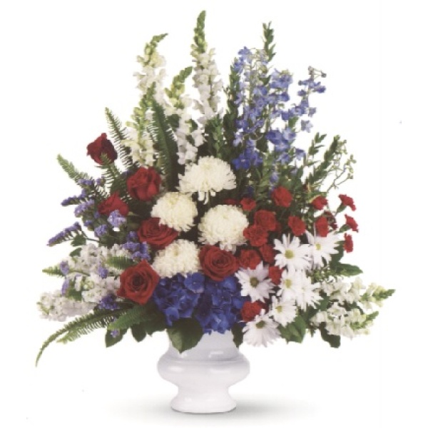 A classic all-American display of patriotic red, white and blue flowers pays tribute to the memory of one who proudly served his country, and is a testament to hope, freedom and strength.