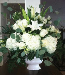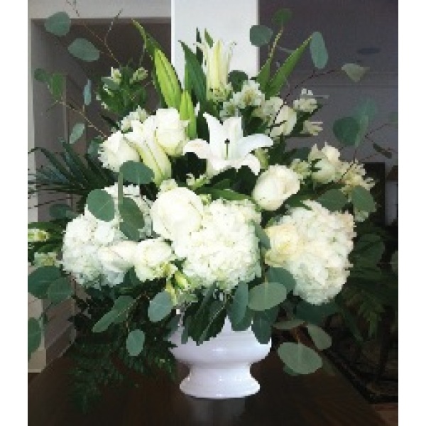 in either a monochromatic white or mixed colors for a gift that can go to the graveside or be transported and placed as a centerpiece in a following reception. White urn is pleasantly suitable for each.