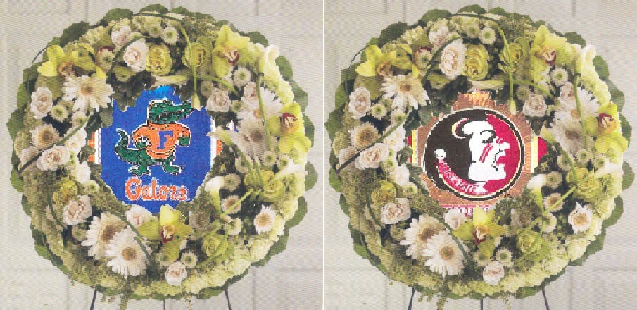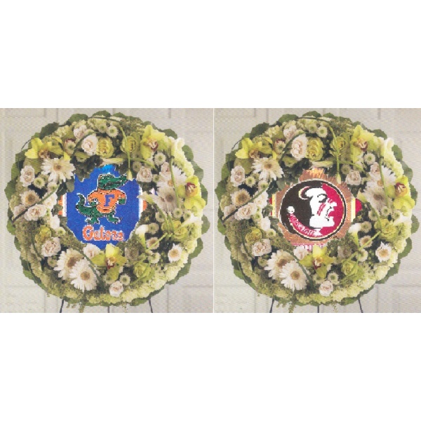 Fragrant and ethereal white blossoms (or any other color scheme) set among a ring of soothing greens form a classic wreath depicting the team pride of a loved one – call us with the details. Team logos available: UF Gators, FSU Seminoles, Tampa Bay Buccaneers and Detroit Tigers. 5ft. metal easel stand included in price.
