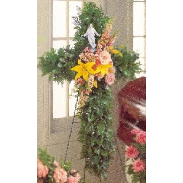 This cross, decorated in pastel colors and lush greens, also includes a meticulously detailed statue of Jesus that will later be cherished as a stunning work of art and keepsake memorial. (Famed sculptor Stuart Mark Feldman designed this graceful, free-standing porcelain sculpture of Christ.)