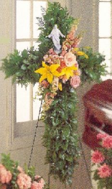 This cross, decorated in pastel colors and lush greens, also includes a meticulously detailed statue of Jesus that will later be cherished as a stunning work of art and keepsake memorial. (Famed sculptor Stuart Mark Feldman designed this graceful, free-standing porcelain sculpture of Christ.)
