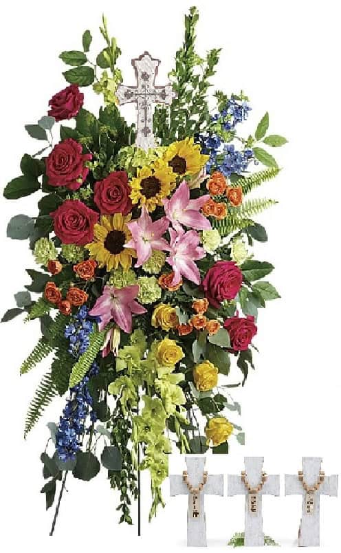 …this keepsake Cross (with embossed tin overlay) is anchored in the top of this lovely colorful standing funeral spray.