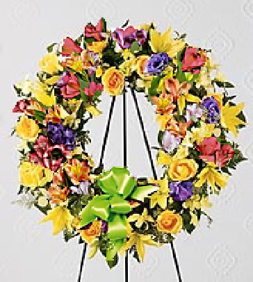 A tribute “Designer’s Choice Wreath” of in-house fresh mixed florals…in an array of mixed colors…will convey your caring message beautifully.