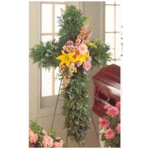 This cross, decorated in pastel colors and lush greens, inspires peaceful thoughts.