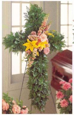 This cross, decorated in pastel colors and lush greens, inspires peaceful thoughts.